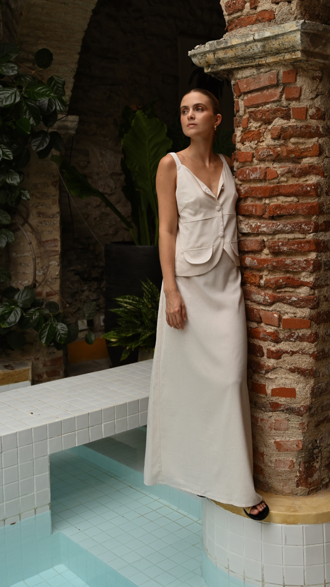 Nuestra falda Irena tiene un diseño de cintura alta, corte recto. El lino, hará que siempre te veas bien vestida, ya sea para eventos más formales o para un estilo más relajado.